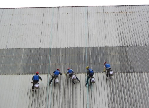 一、高空外墻常用清洗方法1、事前準備工作(1)根據墻面材質及臟污程度,確定相應的清潔劑和工具。必要時應作小塊清洗試驗。(2)弄清屋頂狀況,確定水源、電源。(3)制定整體作業方案。注意事項:屋頂和地面都要確保有人監護,并用步話機保持聯系。2.安裝運載外墻清洗設備、工具及專用清潔劑,包括高壓沖洗機一臺,膠皮管、水桶、毛滾、膠刮、毛巾、刮刀以及清潔劑、溶劑等。3.將高壓沖洗機接上電源、水源、裝好沖洗膠管,檢查好水槍效果。4.作業人員穿上雨褲,攜帶工具、清潔劑上吊籃或吊板。有些工具應用松緊繩栓在吊籃或吊板上,以防不小心失手落下,傷了行人。在地面上設攔護繩和安全告示牌。5.作業方式為從上到下。6.清洗方法:(1)用高壓清洗機接出的膠管或水槍沖洗墻面。(2)檢查墻面上有無粘著物等污跡,如有,先用刮刀等相應輔助工具和溶劑除去。(3)將毛滾浸入桶中,待充分吸入清潔劑后均勻涂抹在墻面上。(4)視墻面臟污程度,用刷子、磨盤、百潔布、膠刮等擦磨,再用清水沖洗凈。(5)確認一次應作業范圍內的墻面已清洗完畢,滑動吊籃或吊板,繼續往下作業。7.全部作業完成后,收拾整理機器設備和工具,撤去地面攔護繩和告示牌,將地面水跡擦凈。