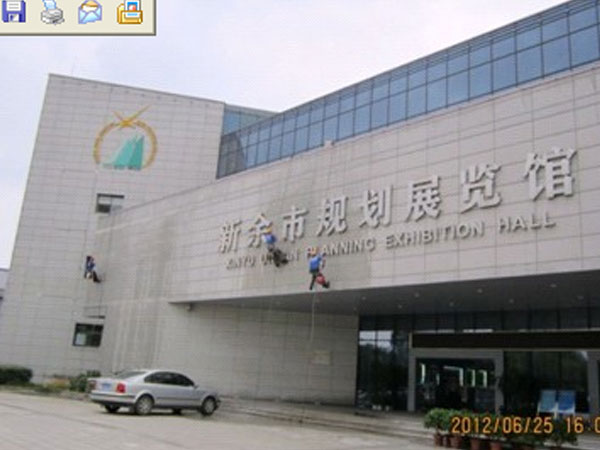 迪邦保潔公司保潔人員正在為“新余市規(guī)劃展覽館”做高空外墻清洗。